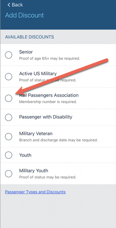 On the next screen, there will be a list of available discounts to add. Click on Rail Passengers Association: