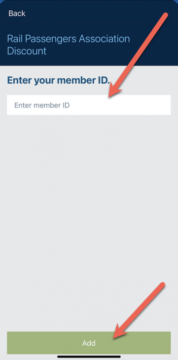 Enter the FIRST SIX digits of your Rail Passengers Association ID# and hit the ADD button: