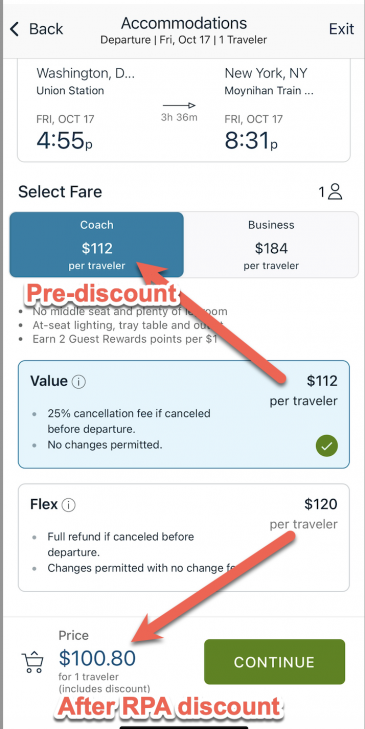 Select your trip, and you will see the Rail Passengers link come up in the “Applicable Discounts” if it is available to use (certain circumstances like weekday Acela or business class it is NOT valid for)