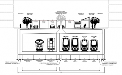 A "Train Box" is a below-grade concrete structure designed to house railroad tracks. In this system, rails are laid within the enclosed structure, enabling trains to pass through downtown without disrupting surface-level activity. The Train Box proposed by the Rio Grande Plan would feature six tracks and an adjacent service road for maintenance, accommodating both passenger and freight trains.