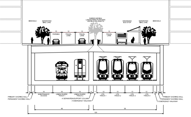 A "Train Box" is a below-grade concrete structure designed to house railroad tracks. In this system, rails are laid within the enclosed structure, enabling trains to pass through downtown without disrupting surface-level activity. The Train Box proposed by the Rio Grande Plan would feature six tracks and an adjacent service road for maintenance, accommodating both passenger and freight trains.