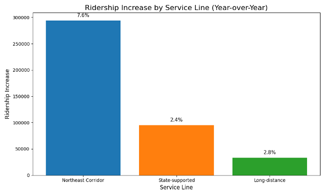 Chief Financial Officer Costin Corneanu told the board that ridership climbed by 422,000 passengers compared to the same period last year, a 4.7% year‑over‑year increase, exceeding internal forecasts by 49,000 riders. Growth was seen across all business lines, with the Northeast Corridor (NEC) up 294,000 passenger trips, state‑supported services up 95,000, and long‑distance trains up 33,000.