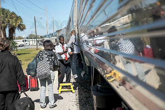A coach attendant on the Silver Meteor assisting passengers at Winter Haven, Fla. Photo by Chuck Gomez for Amtrak, from the Amtrak Corporate Collection.