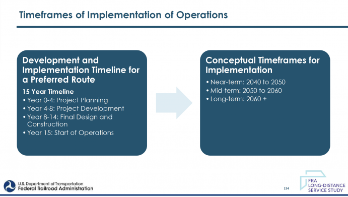 Well, this is the Rail Passengers’ blog so you know the answer is “Yes.” But the timeline assumed in the long-distance study for getting services going is soberly realistic...which is to say it is depressingly long. Take a look at this slide from the Round Three summary presentation by the FRA-led study team: