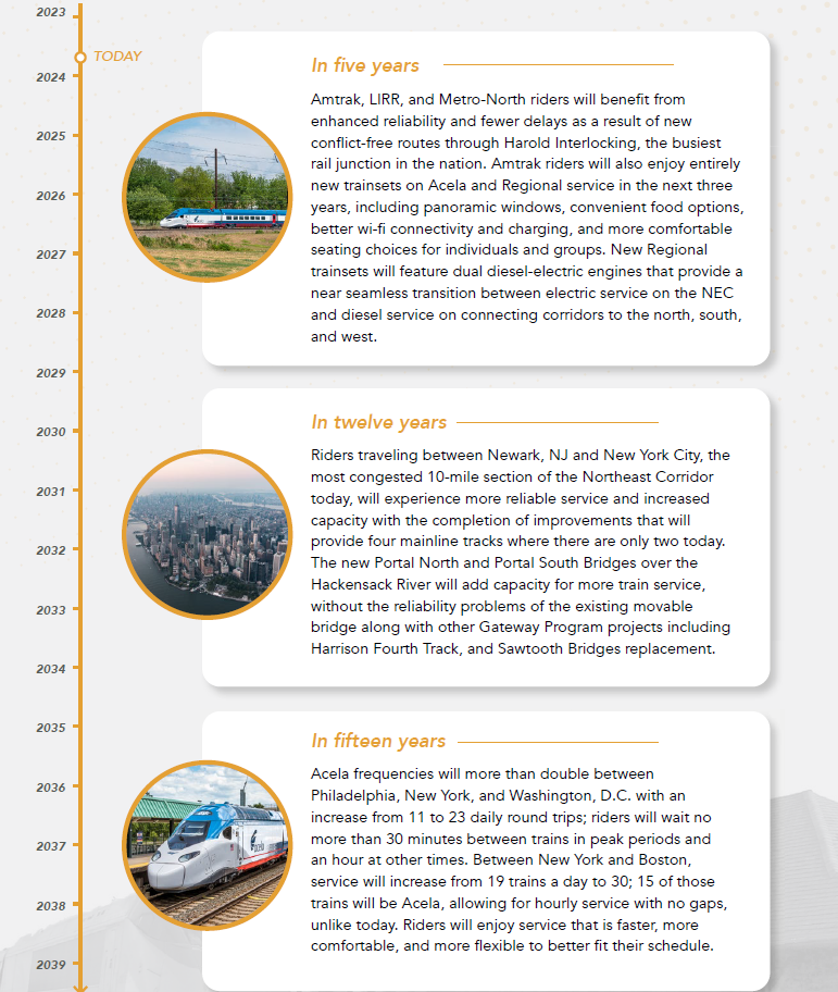 The Northeast Corridor Commission has released a 15-year plan, known as CONNECT NEC 2037 (C37), to improve commuter & intercity rail service along the 457-mile corridor from Washington, DC to Boston, MA. The plan calls for more frequent service, faster trains, and critical infrastructure improvements - funded by the Biden administration's $16.4 billion investment in place thanks to the 2021 Bipartisan Infrastructure Law. The commission says that the plan will provide much-needed capacity, reliability, and improvements for the millions of passengers that use rail service in the northeast on a daily basis.