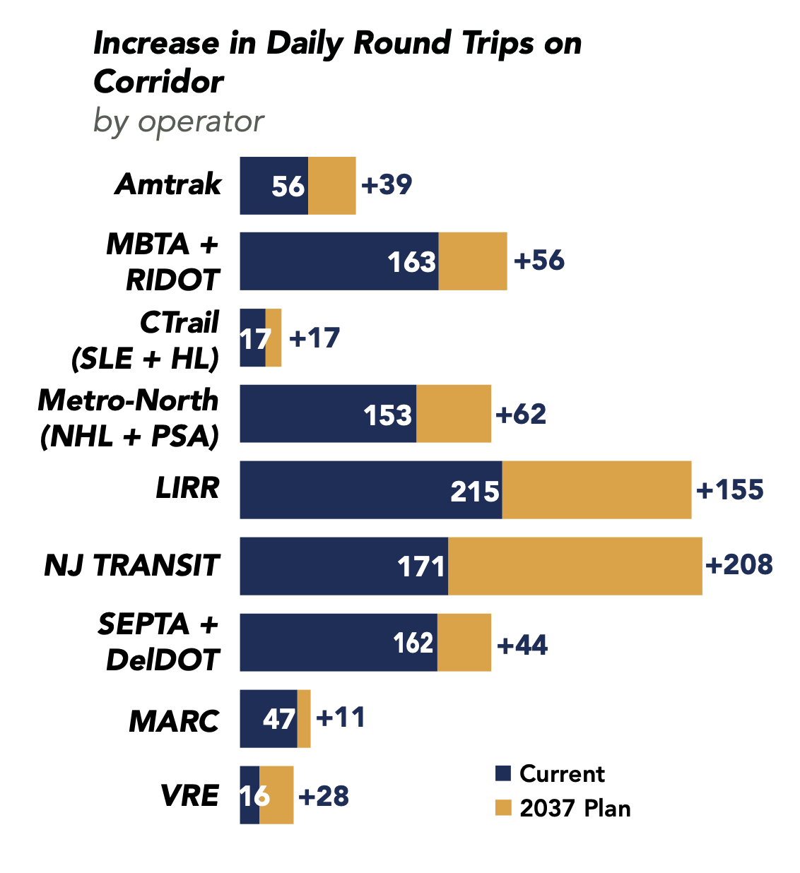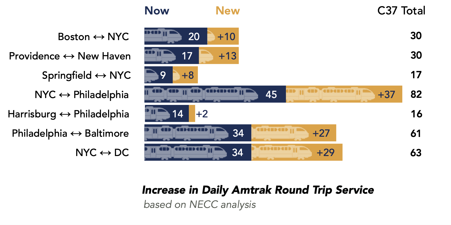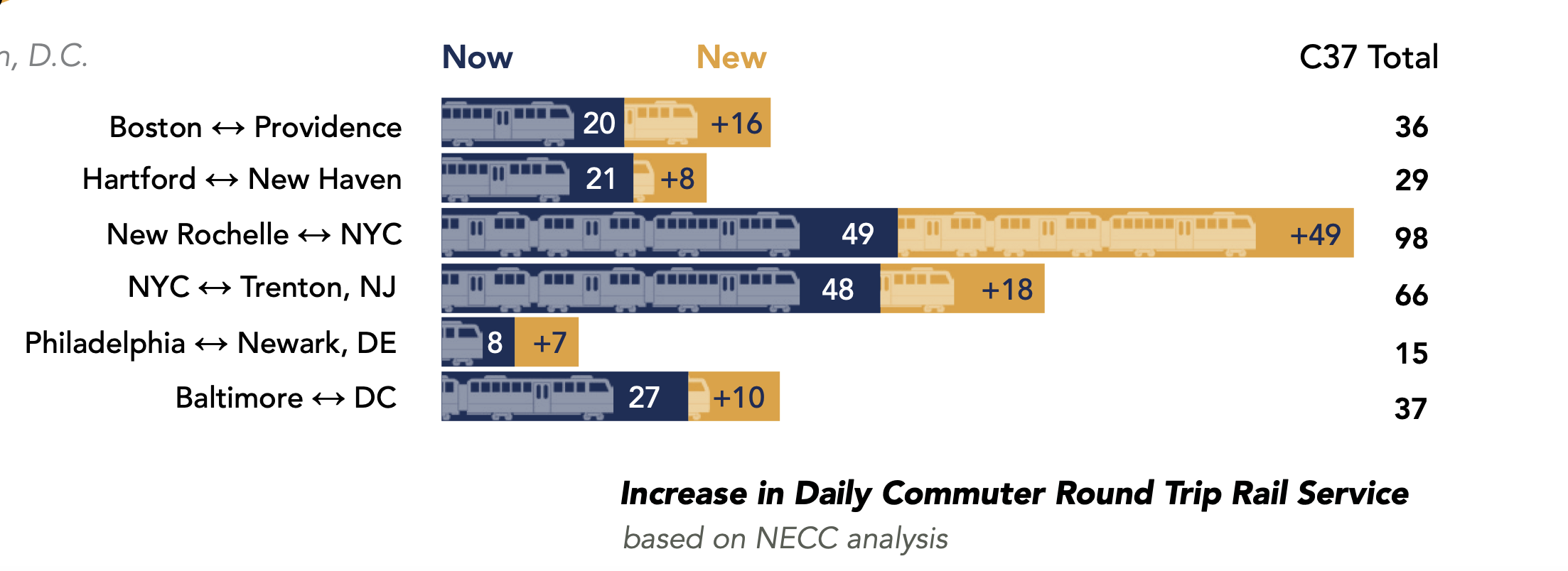 - 60% increase in commuter rail service via MBTA, CTRail, Metro-North, LIRR, NJTRANSIT, SEPTA, MARC, & VRE