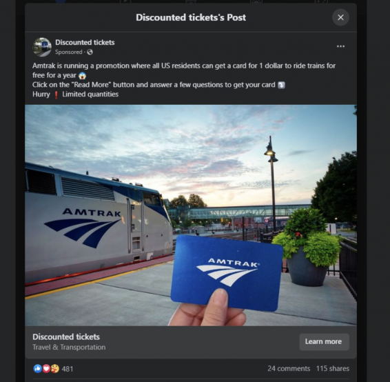 It appears on Facebook under various names, and claims that if you pass on your personal information, you can get a "pass" from Amtrak to ride all year long for just one dollar.