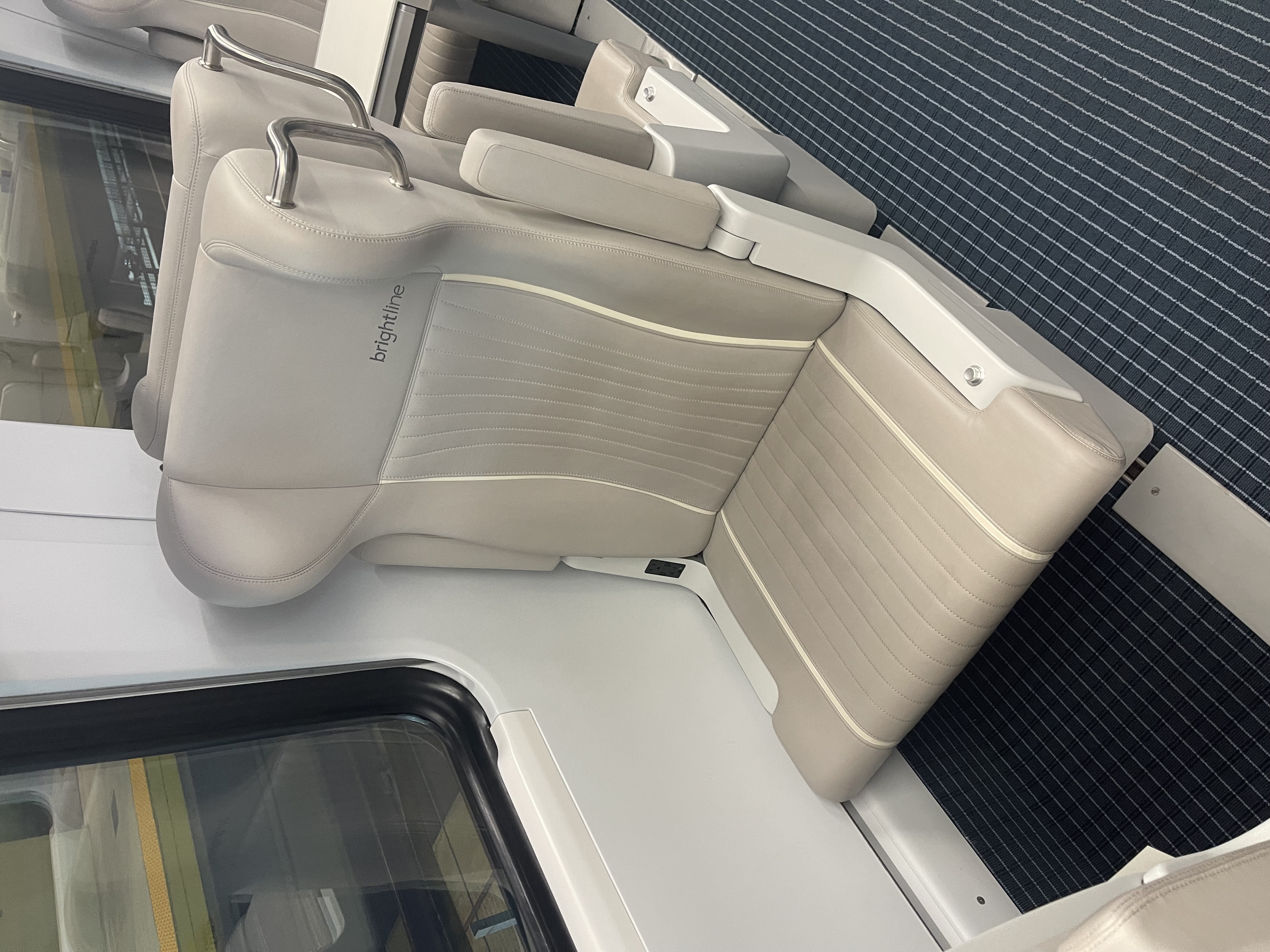 The train ride was quite a smooth ride and Brightline’s newer Siemens equipment is sleek, modern, and spotless. The seats are quite comfortable, though one thing I missed from Amtrak seating is the ability for the seat back to recline -instead, the lower part of the seat can move forward towards the seat in front of you to allow one to sit back a bit. The premium class seats are a bit wider, so they are arranged in 2x1 configuration, while in the basic Smart class they are 2x2. The trains are operated “push-pull” (meaning they are not turned around at the end points) so there are seats facing both directions and the seats in the middle of the car at the transition points have tables. The seats come with all the amenities you would expect – tray tables – overhead reading light, and baggage storage, as well as power outlets and USB charging ports for your mobile devices on both sides. There are also window shades that can be pulled down. The Wi-Fi seemed a lot speedier and more reliable than the service I had on any other previous train ride, and the internet service for the Wi-Fi is by SpaceX’s much talked about Starlink satellite service. The restrooms are fully accessible, clean, and modern with touchless controls and automatic doors. The trains move fast with 125 MPH speeds on the newly constructed dedicated alignment for Brightline between the Florida East Coastline and Orlando airport, and they max out at 90 MPH on the shared Florida East Coast corridor – they are testing to increase this to 110 MPH. The on-board crews were all very friendly and provided very timely announcements about any unexpected delays, including slowdowns for train meets. We took a lengthier delay on the way back north for a draw bridge that would not close, and the crew provided timely updates on the situation while we were stopped.