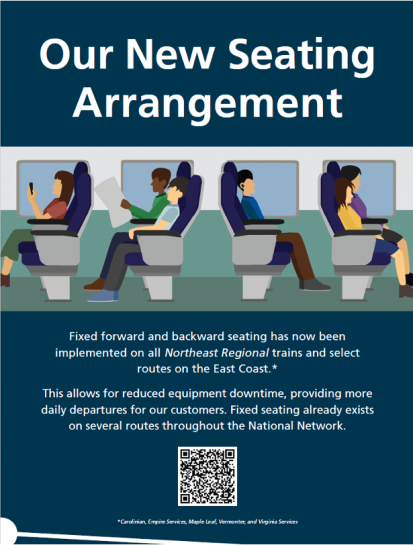 Starting tomorrow, Northeast Corridor trains will begin transitioning to “fixed seating” – in other words, half of each car will have seats facing forward, while the other half will face the rear. The Northeast Regional trains, plus the Carolinian, Empire Service, Vermonter, and Amtrak Virginia, will all make the change.