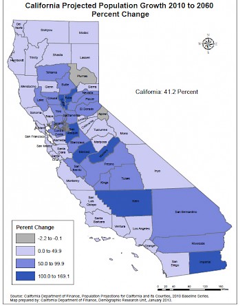Faced with roads, airports, and trains that are already overused and overburdened, the state is struggling to accommodate this growth. Local leaders pushed for the high speed rail system as a cost-effective way to deal with a booming population. If you look at the map created by the CDOF, you can see that the growth is projected to take place in the Central Valley spine, ranging from the Bay Area to the Mexican border—almost exactly where the high speed corridor is located.