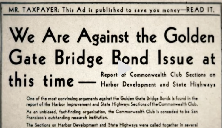 The program draws parallels between the politics surrounding the Golden Gate project and the objections to passenger rail investment we hear today. “When this bridge was conceived there was tremendous opposition,” said Dennis Mulligan, who today is the CEO of the Golden Gate bridge. “There were over 2,000 lawsuits filed to stop the bridge.”