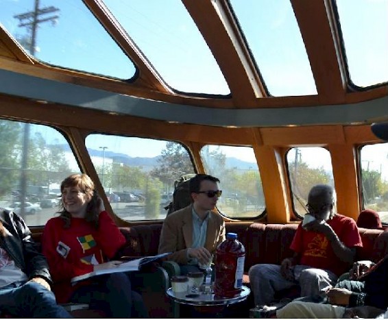 “This is religion, man. You sit on the train, and your stress just disappears over the miles with the scenery” a singer in the iconic Reggae band The Congos remarked from the Skytop Lounge. There were scores of young photographers that seemed completely entranced by the discovery of such a significantly different vantage point. With very few exceptions, the passengers on the train were all exploring and luxuriating in a strangely new experience, at least the ones who weren’t busily editing film or coordinating what would become the “happening” we were speeding towards in Oakland, CA. In a way, we rail advocates have to thank Doug Aitken for conceiving of a project with such a delicious subliminal effect: the train may have been a means to an end in the spirit of artistic collaboration, but in the same fell swoop, the trip exposed hundreds of culture makers to what train travel can be.