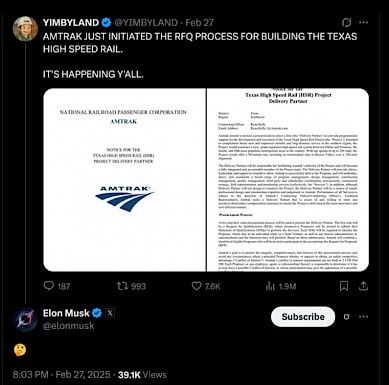 The Rail Passengers Association supports many different forms of public-private ventures, which this Texas Central project was. But we hope that Duffy’s announcement isn’t an ideologically driven decision to turn it over to the “free market” and a prayer. Billionaire and Trump advisor Elon Musk’s interest six weeks ago in the announcement of a search for an operating contractor makes me at least have to ask the question.