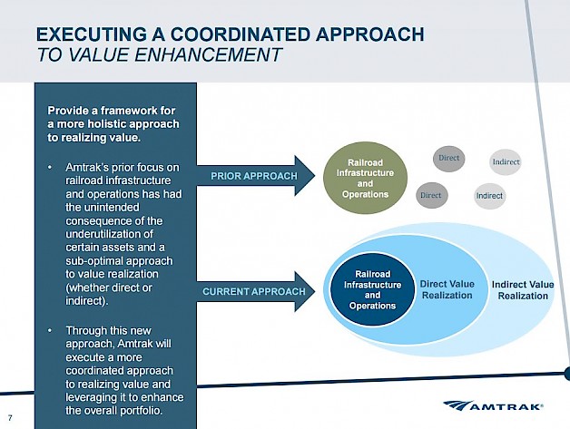 Amtrak is also visualizing this process in a remarkable way. The presentation slideshow (worth a look) emphasizes a coordinated approach to value enhancement of their latent properties. Rina Cutler, Amtrak's Senior Director for Major Stations Planning & Development, was brought on a scant 15 months ago, and the shift in perspective at Amtrak surrounding these properties is perhaps only three years old at most. Despite the short tenure, the approach is appropriately holistic. One of the slides explicitly shows a "prior" approach to Amtrak's property asset management, with value realization being totally disassociated with operations, as if left to chance. Now, railroad operations forms the core, with direct and indirect value capture emanating directly from it: