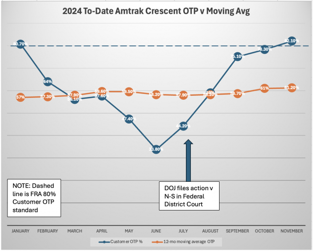 And here’s something else to suggest that the Crescent’s delays on Norfolk Southern territory were largely avoidable: in the five months since the Justice Dept. filed its action, Customer on-time performance for the Crescent rebounded from a low of 33 percent to 82 percent in November. That’s good enough to meet the 80 percent standard set out in regulations during the last month of the first Trump Administration in 2020. Funny how getting hauled into court can concentrate your mind.
