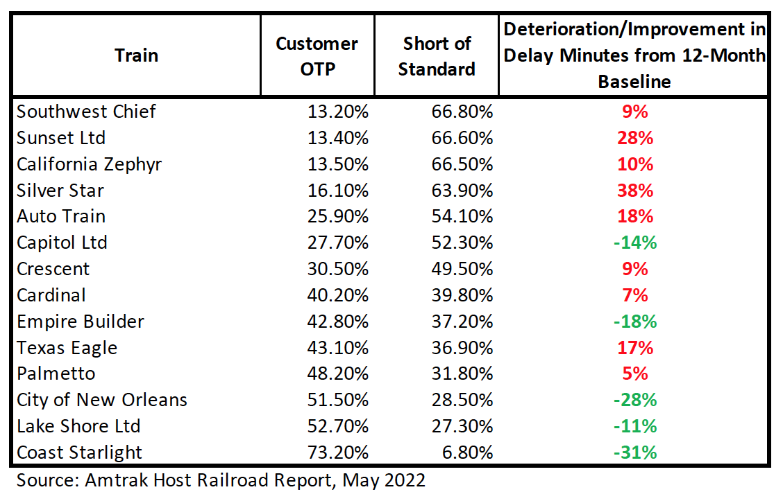 May was a bad month for late trains, with Amtrak reporting that passengers on nine out of 14 long-distance trains suffered even more delay minutes than the previous 12-month average.