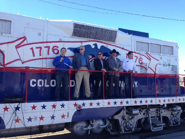 Pueblo County Commissioner Sal Pace; James Souby, Colorado Rail Passengers Association and National Association of Railroad Passengers; Charlie Skidmore, SMART Union; State Senator Larry Crowder; and State Representative Leroy Garcia (L-R). Photo by Rick Manzanares, Execuitve Director, Canyons & Plains of SE CO