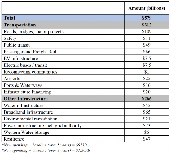 A bipartisan group of senators joined President Joe Biden to announce a breakthrough in infrastructure negotiations today, revealing an eight year, $579 billion framework focused on core infrastructure needs. The deal includes $312 billion for transportation, including $66 billion for passenger and freight rail, $49 billion for public transit, $25 billion for airports, and $109 billion for highways and bridges.