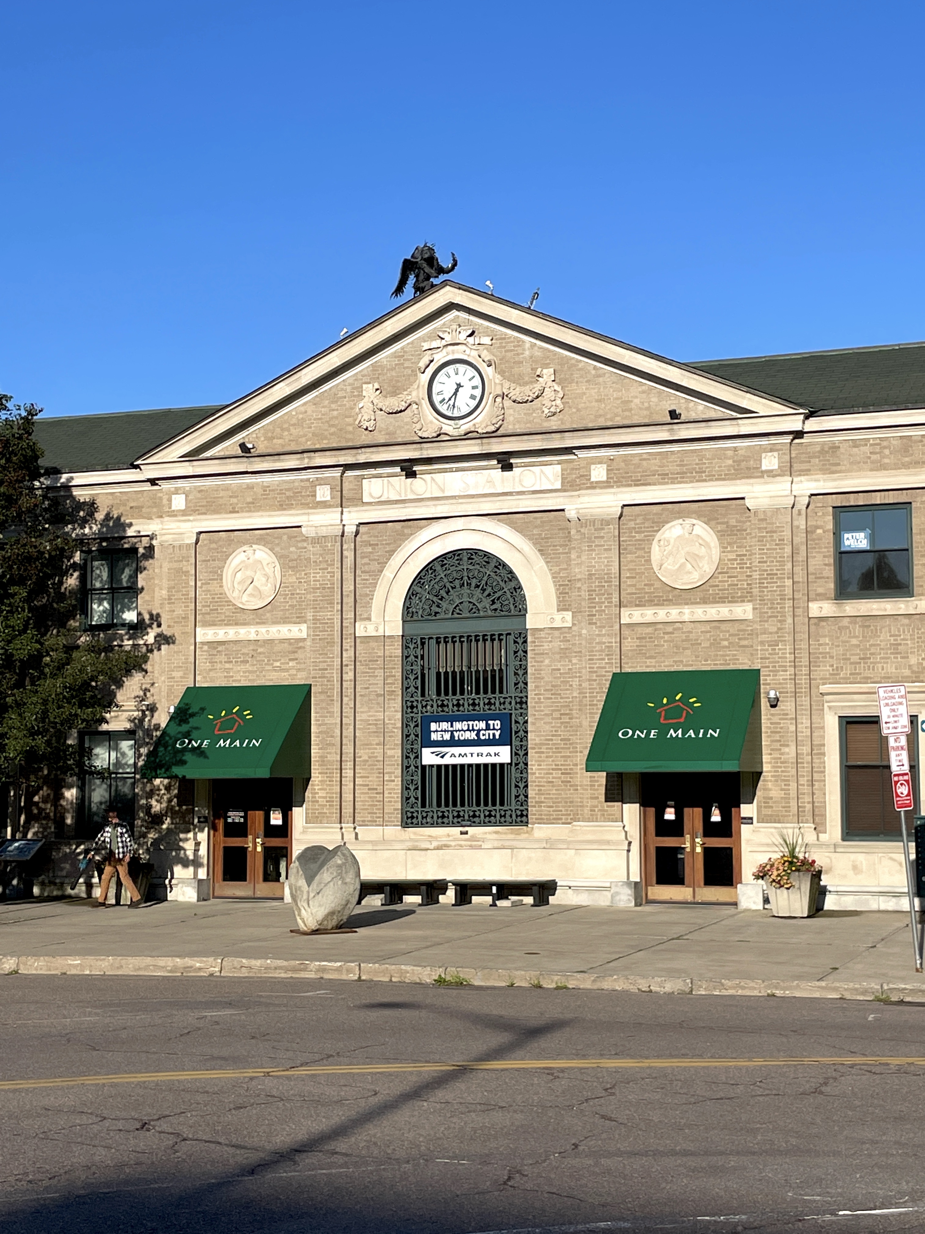 Now let’s ride the ETHAN ALLEN EXPRESS from Burlington to New York. The gloriously restored Burlington Union Station is our boarding point. This may be the classiest Amtrak station in the northeast staffed only by caretakers. The new trackside waiting room alone is immense, with grand historic wooden bench seats and a stately covered passageway to the tracks. Above the platform at the Main Street level is an outdoor viewing terrace, from which sweeping views can be enjoyed of the Burlington waterfront and Lake Champlain. There is even a touch of humor on the front and rear facades of the building—gargoyles in the form of giant flying monkeys stand guard!