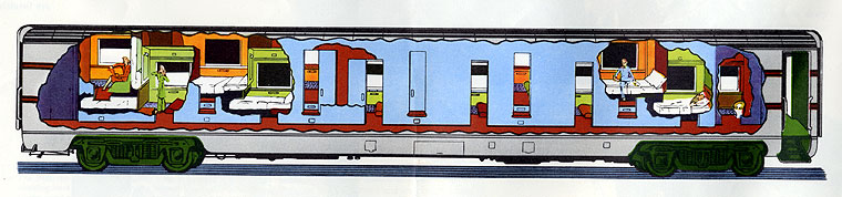 By the 1950’s rail accommodations had diversified intensely, with almost every conceivable permutation of a hotel room on wheels having been explored. In the face of diminishing ridership towards the end of the fifties and early sixties, an economy player was introduced by the Budd Company of Philadelphia. By staggering private rooms on top of each other, a “slumbercoach” as they came to be known could accommodate almost as many passengers as a standard passenger coach. For a very slight fee, a coach-class passenger could have a private room and bed. Rooms were quite small, but then again, so was the price. The cars continued to serve under Amtrak until the mid 1990’s, evidence of the worth inherent in the concept.