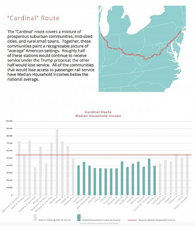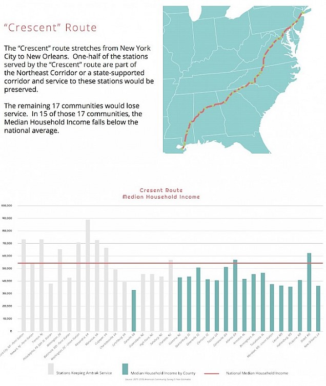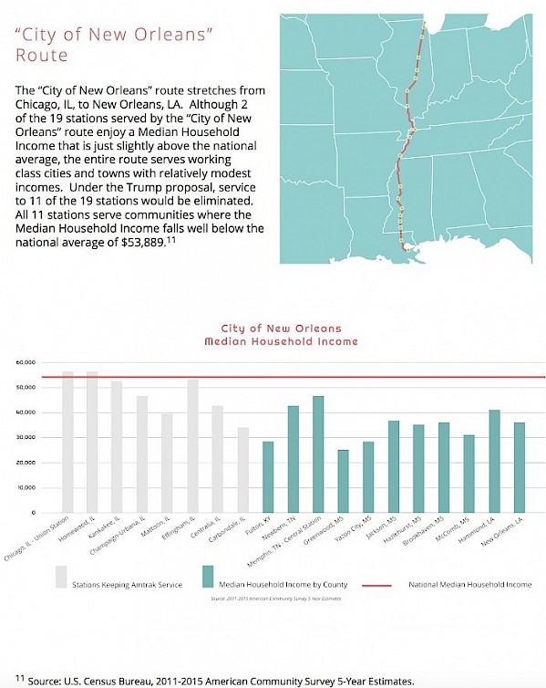 Consider the City of New Orleans, which stretches from Chicago, IL, to New Orleans, LA. Just 2 of the 19 stations served by the “City of New Orleans” route enjoy a Median Household Income just slightly above the national average, while the entire route serves working class cities and towns with relatively modest incomes. If you eliminated this train, service to 11 of the 19 stations would be eliminated. All 11 stations serve communities where the Median Household Income falls well below the national average of $53,889. I’ve included a full breakdown of median income of communities along three Amtrak routes from our September 2017 report “Dismantling a National Transportation Network” (which we produced in response to the Trump Administration’s proposal to eliminate all National Network rail service) in an appendix to this statement.