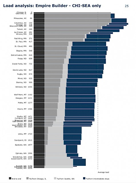 And just as few passengers take the Acela from Washington, DC, all the way to Boston, so too do long-distance trains serve a number of intermediary corridors. The Empire Builder doesn’t exist solely to take people from Seattle to Chicago; only ten percent of the half million people it carries each year do. Overwhelmingly, passengers ride between intermediate stations. Some people argue that since only one-in-ten people take a train from end-to-end, you can provide the same level of public utility at a lower price by eliminating the middle segment. This is equivalent to thinking that since only one-in-ten people ride an elevator from the ground floor to the top floor, you can move people around a building more cost-effectively by eliminating the elevator shaft for the middle floors. These are more than just long-distance trains—they are interstate transit networks.