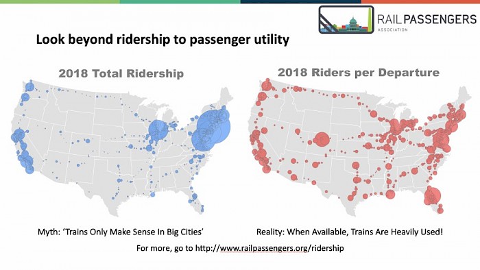 The argument that there is not enough demand in these towns falls away quickly when you look more closely. Just consider the comparison between simply measuring the total ridership and looking at the number of riders per departure—i.e., if the train only runs three days a week, normalize the ridership figure to account for the four days that it doesn’t run. The map included is one I use a lot to tell that story when I present to elected and appointed officials. The picture is indeed worth a thousand words and clearly shows a National Network that is well-used and vital to communities across the country.