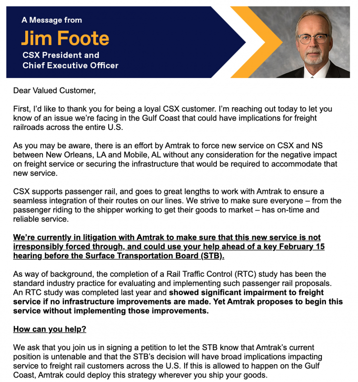 CSX CEO Jim Foote sent a message to the railroad’s customers asking them to sign-on to legal action the railroad is taking against Amtrak to make sure that the “new service is not irresponsibly forced through.”