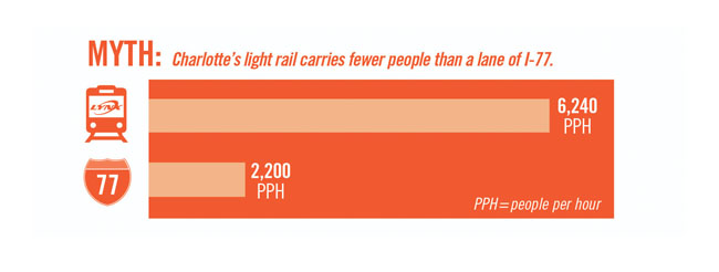 CATS operates a six-year-old, 9.6-mile light rail line in North Carolina’s largest city, which is a national financial center (home to Bank of America’s headquarters), and the city seeks to expand the system by lengthening the existing line, adding at least one more light rail line, and building a streetcar in Uptown (the central business district). But the city faces headwinds from critics who use false figures and data taken out of context to make transit seem irrelevant. CATS is taking these critics head-on by posting graphics like this that proclaim the facts on the sides of buses and trains: