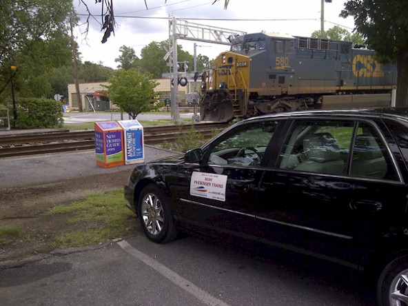 The Lipperts were joined in their efforts by NARP Vice President Jim Churchill. A Cadillac salesman by trade, he made good use of the NARP sign in capturing the above photo along the MARC Camden Line (featured at top).