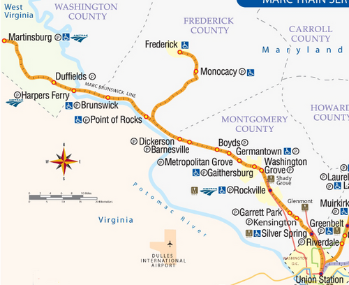 The Maryland MARC Train's Brunswick Line. Map from the Maryland Transit Administration.