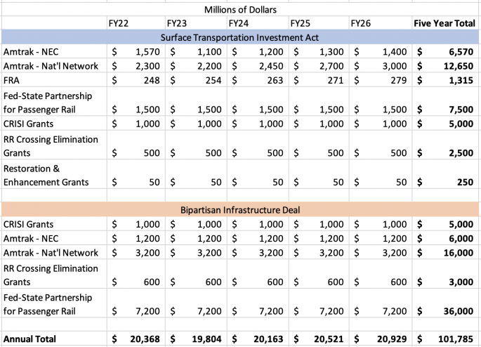 [Nb. It’s important to note that future appropriations aren’t guaranteed in the absence of a passenger rail trust fund. That means only $66 billion of the rail funds are guaranteed, with the remainder at the discretion of appropriators. There’s no assurance that the additional $36 billion in investment will ever fully materialize. This creates uncertainty around federal operating funds and total levels of capital investment, potentially hindering the ability of States and Amtrak to effectively execute multi-year capitalization plans.]