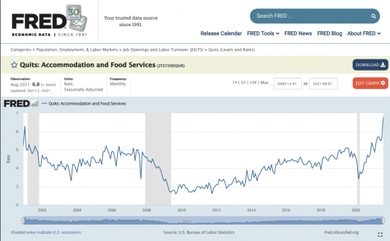 Earlier this month, BLS released its August report and it found that for a fifth month in a row, quit rates have reached record highs. “Record” as in never before seen in the history of tracking that statistic. Ever.