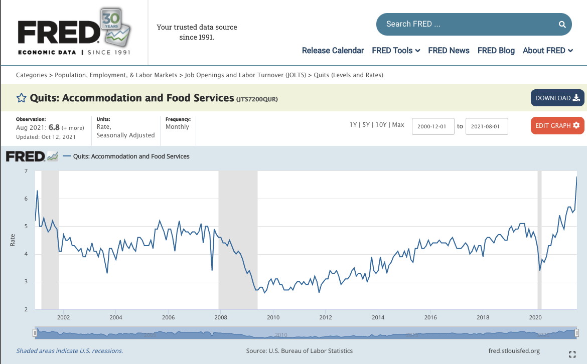 You may have never heard this term, but it’s what labor economists have been calling the phenomenon that has been gripping the U.S. in the latter stages of our Covid pandemic recovery. Here’s a scenario I’m guessing you’ll find familiar: now that you and your family are vaccinated, you feel safer going out and you yearn to return to something like a normal life. You decide to take the family out for a nice dinner, only to find that your favorite pre-pandemic eatery is only open three days a week...or open only until 4pm...or only has one waiter for 30 tables...or maybe there’s a sign on the door that says “Closed: We’re Hiring!”