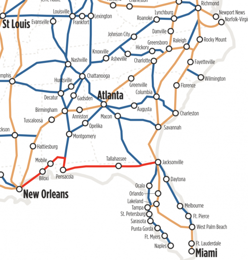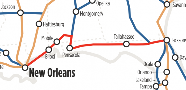 The Gulf Coast rail connection between Florida and Louisiana was knocked out more than a decade by Hurricane Katrina. Since that storm, all modes of transportation crossing the Gulf Coast have been reestablished except for passenger rail.