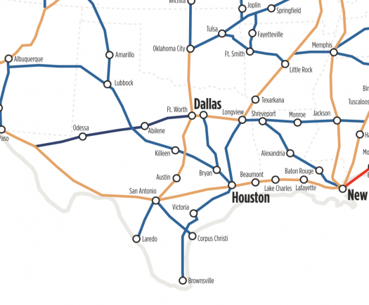 Through the Texas-Oklahoma Passenger Rail Study, TxDOT studied how passenger rail service could address the needs of this 850-mile corridor. TxDOT preferred a mixed corridor, with a high-speed spine between Dallas-Fort Worth and San Antonio, and conventional speed services between DFW and Oklahoma City and San Atonio and South Texas. This corridor will be essential to meeting the needs of the booming Texas population and maintaining the regional economy in the face of growing congestion. [VOTE NOW]