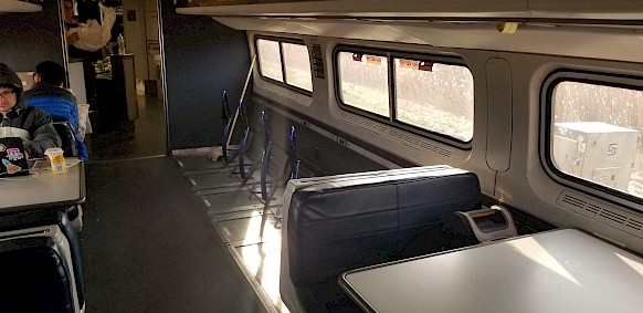 As observed on this morning’s eastbound train during the Buffalo-Depew station stop, of the four remaining tables in the car, one was being used by the car’s attendant for a necessary condiment display and one was reserved for the operating crew’s use, leaving at most just 8 non-revenue seats available for the train’s six cars of coach passengers.