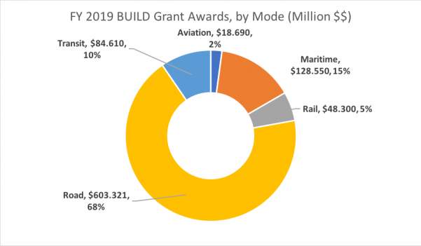 Highway and bridge projects overwhelmingly received the majority of the funding at $603.3 million (68%). This mirrors the 2018 grant awards which were also highly skewed to highway projects.
