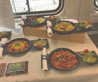 During the menu sampling today aboard a Viewliner II diner, five hot options were on the menu: a braised beef dish with polenta, carrots and green beans, a sweet-and-sour Asian noodle bowl, a penne pasta with meatballs, a chicken fettuccine entree and a shrimp and rice entree with andouille sausage. The Asian noodle bowl is vegan, and all come with a fresh green salad.