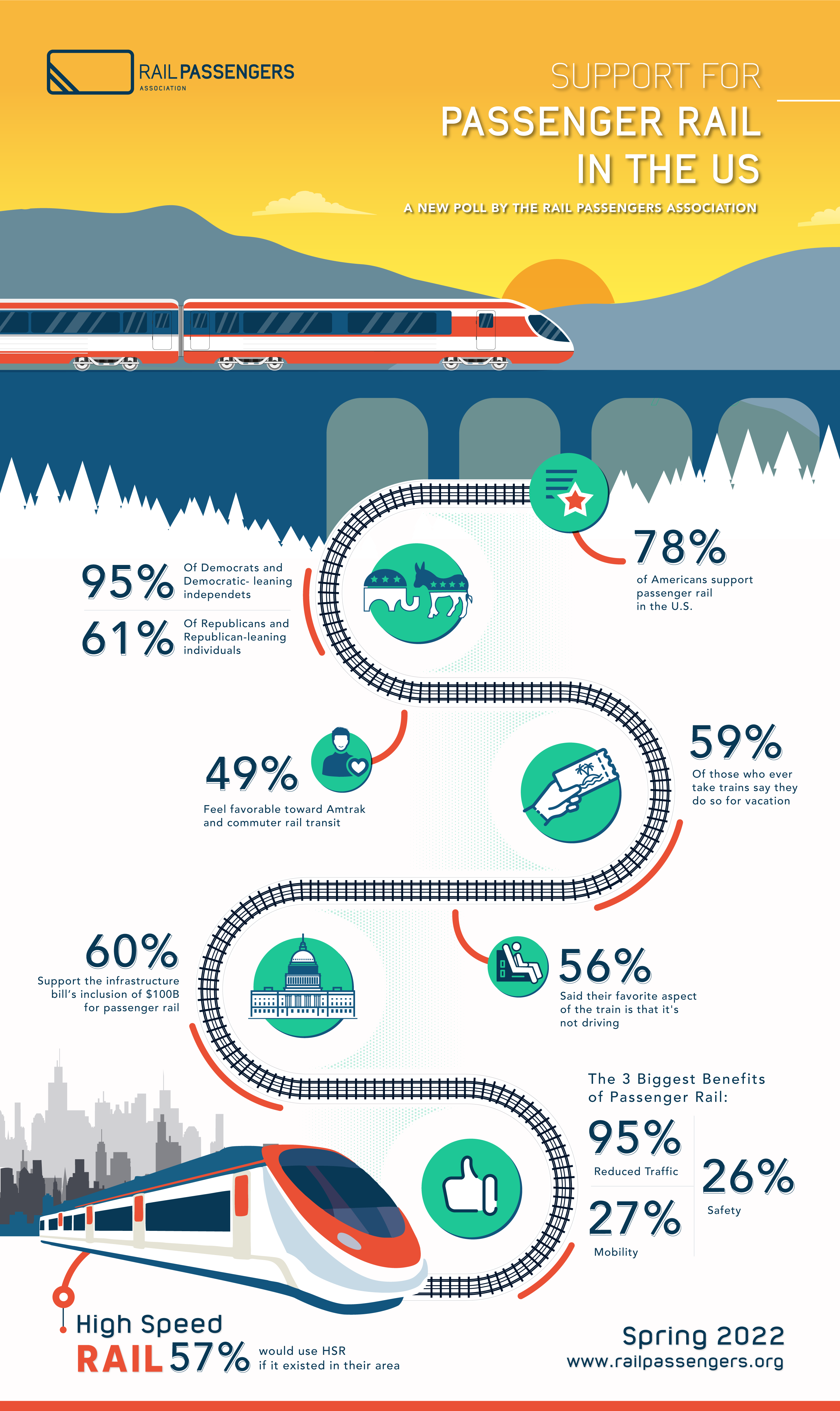 Washington, D.C. -- The vast majority of Americans want the federal government to invest in strengthening the national passenger rail network, according to a new poll by the Rail Passengers Association (RPA), the nation’s largest advocacy organization for rail passengers. Specifically, 78% of respondents said having a strong passenger rail system in the U.S. is “Important” and 66% said they support adding more routes to the current rail network.