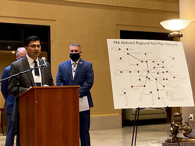 Chicago, Illinois — Rail Passengers Association joined the Federal Railroad Administration (FRA), Amtrak and representatives from a half dozen midwestern states at Chicago Union Station today for the unveiling of the Midwestern Regional Rail Plan. The document will help the federal government and states coordinate infrastructure investments to upgrade and expand the region’s passenger rail network, helping midwestern states compete for $66 billion in federal rail funding in the bipartisan infrastructure bill currently before Congress.