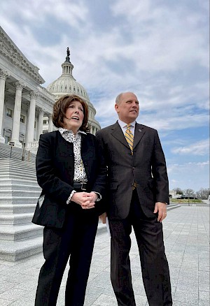 Newly Elected Rail Passengers Chair Meredith Richards, left, and President & CEO Jim Mathews wait to present Congressman Peter DeFazio (D, OR-4) with the Association's Golden Spike Award on the Capitol steps (March 30, 2022. Photo credit: Rail Passengers Association)
