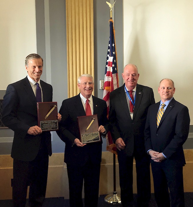 Washington, D.C. – U.S. Senator John Thune (R-SD) and U.S. Senator Roger Wicker (R-MS) were honored with a prestigious award conferred by the National Association of Railroad Passengers (NARP) last night at the organization’s annual Congressional Reception. The “Golden Spike” Award is given to individuals who promote and help advance the cause of American passengers. The award was presented to Senators Thune and Wicker for their leadership in passing the bipartisan Fixing America's Surface Transportation (FAST) Act, the first comprehensive surface transportation bill to include passenger trains.